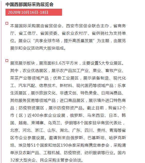 中國西部國際采購展覽會(以下簡稱“國際采購展”),于2020年10月16日-18日在西安國際會展中心展覽館1號展廳舉行。本屆國際采購展以“共享全球市場,提升高質(zhì)量發(fā)展”為主題,深度融入共建“一帶一路”,助力陜西打造內(nèi)陸改革開放高地,落實好穩(wěn)外資、穩(wěn)外貿(mào)的要求,更好服務(wù)疫情常態(tài)化形勢下企業(yè)開拓國際市場。我公司受西安貿(mào)促會邀請參加本次展覽會。